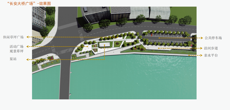 ③長安大橋廣場,建設面積為6723㎡,主要建設內容為休閑草坪廣場、活動廣場、觀景草坪等。