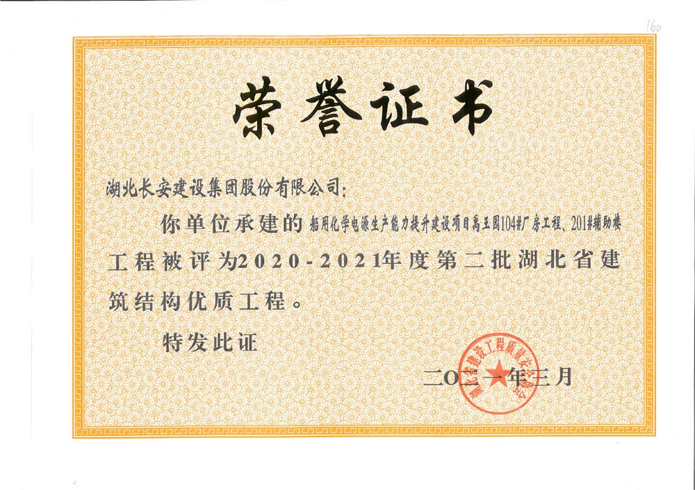 船用化學電源生產能力提升建設項目禹王園104#廠房工程、201#輔助樓工程2020-2021年度第二批湖北省建筑結構優質工程