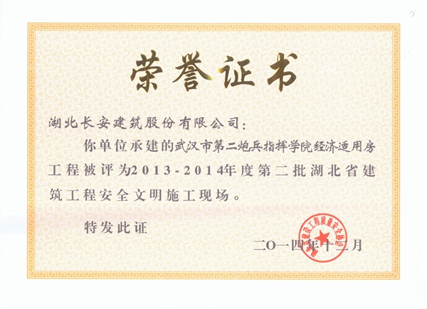 武漢市第二炮兵指揮學院經濟適用房被評為2013-2014年度省建筑工程安全文明施工現場