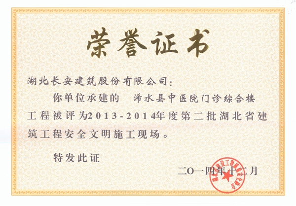 浠水中醫院門診綜合樓被評為2013-2014年度省建筑工程安全文明施工現場