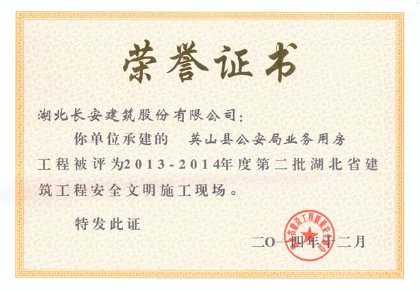英山縣公安局業務用房被評為2013-2014年度省建筑工程安全文明施工現場