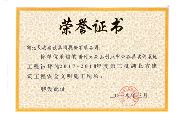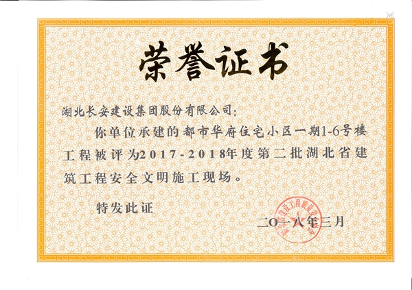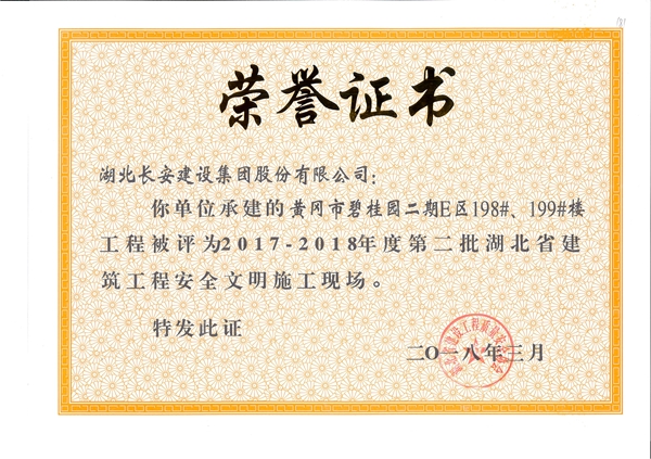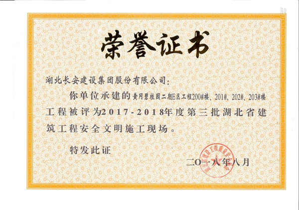 黃岡碧桂園二期E區工程(200#樓、201#樓、202#樓、203#樓)工程被評為2017-2018年度第三批湖北省建筑工程安全文明施工現場