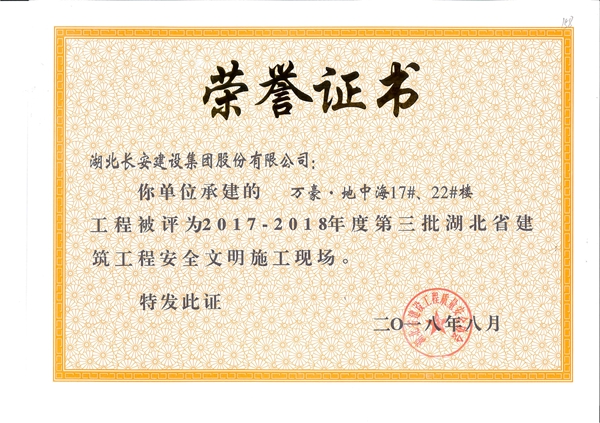 萬豪地中海(17#、22#樓)工程被評為2017-2018年度第三批湖北省建筑工程安全文明施工現場
