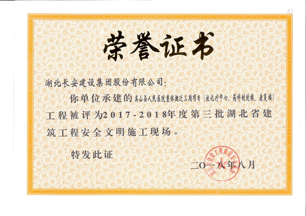 英山縣人民醫院整體搬遷三期項目(放化療中心、藥科制劑樓、康復樓)工程被評為2017-2018年度第三批湖北省建筑工程安全文明施工現場