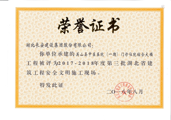 英山縣中醫醫院(一期)門診住院綜合大樓工程被評為2017-2018年度第三批湖北省建筑工程安全文明施工現場