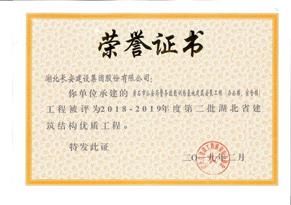 黃石市公安局警務技能訓練基地建筑安裝工程(辦公樓、宿舍樓)工程被評為2018-2019年度第二批省結構優質工程