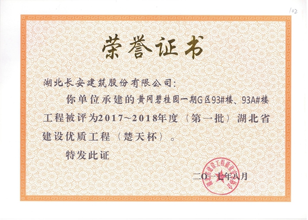 黃岡碧桂園一期G區93、93A#樓被評為2017-2018年度第一批省建設優質工程楚天杯