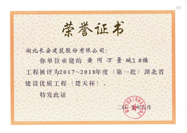 黃岡萬景城1#樓被評為2017-2018年度第一批省建設優質工程楚天杯
