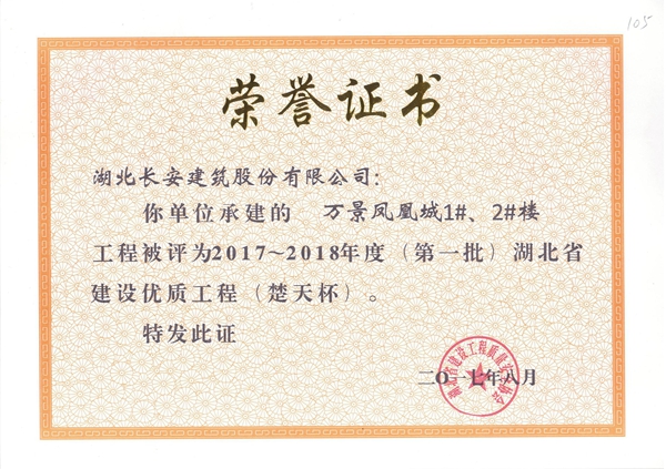 萬景鳳凰城1、2#樓被評為2017-2018年度第一批省建設優質工程楚天杯