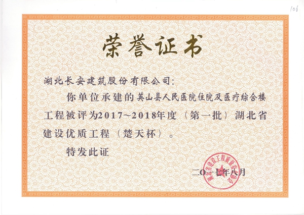 英山縣人民醫院住院及醫療綜合樓被評為2017-2018年度第一批省建設優質工程楚天杯