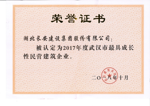 2017年度武漢市最具成長性民營建筑企業(yè)(證書)