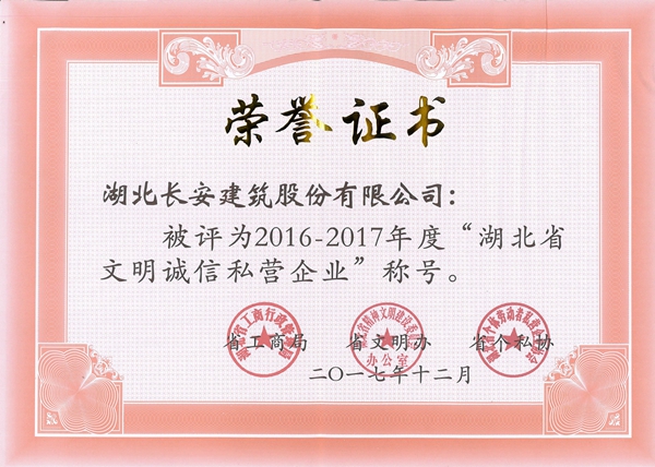 公司被評為2016-2017年度“湖北省文明誠信私營企業(yè)”2017