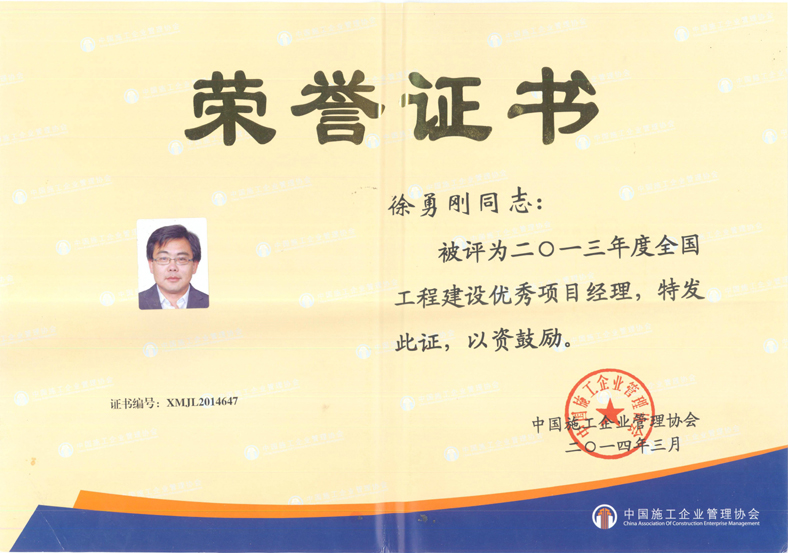 2013年度全國工程建設優(yōu)秀項目經(jīng)理(徐勇剛)