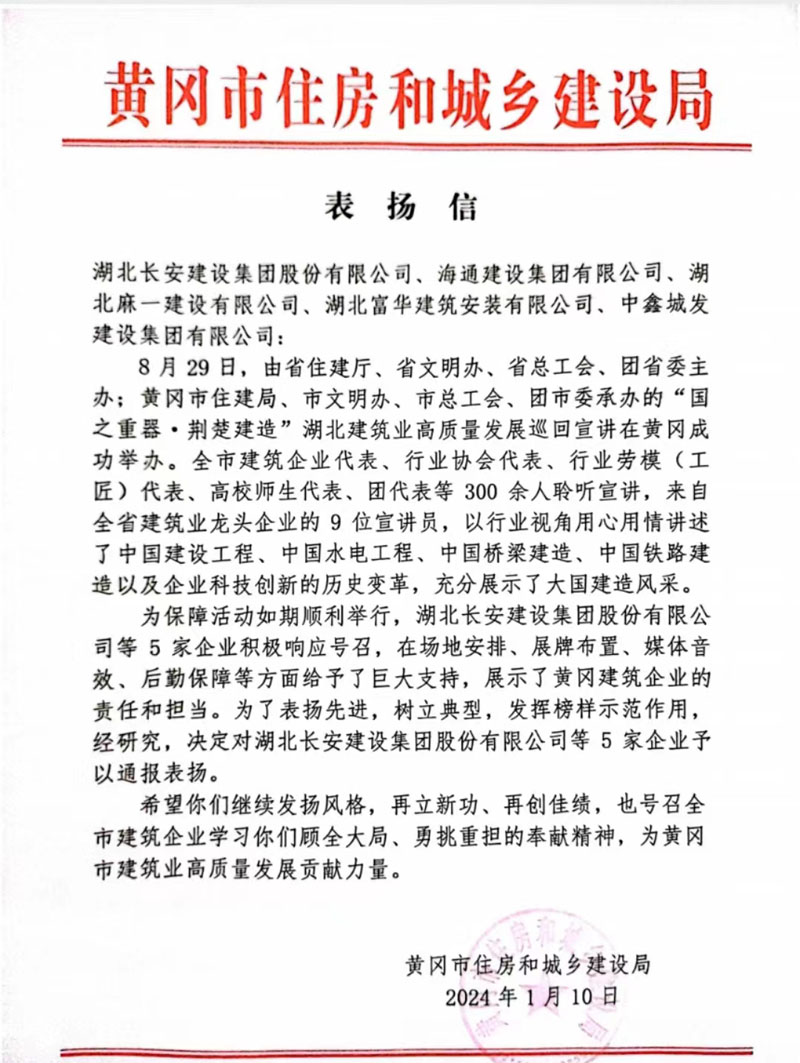 集團公司參加“國之重器?荊楚建造”湖北建筑業高質量發展巡回宣講活動獲表彰