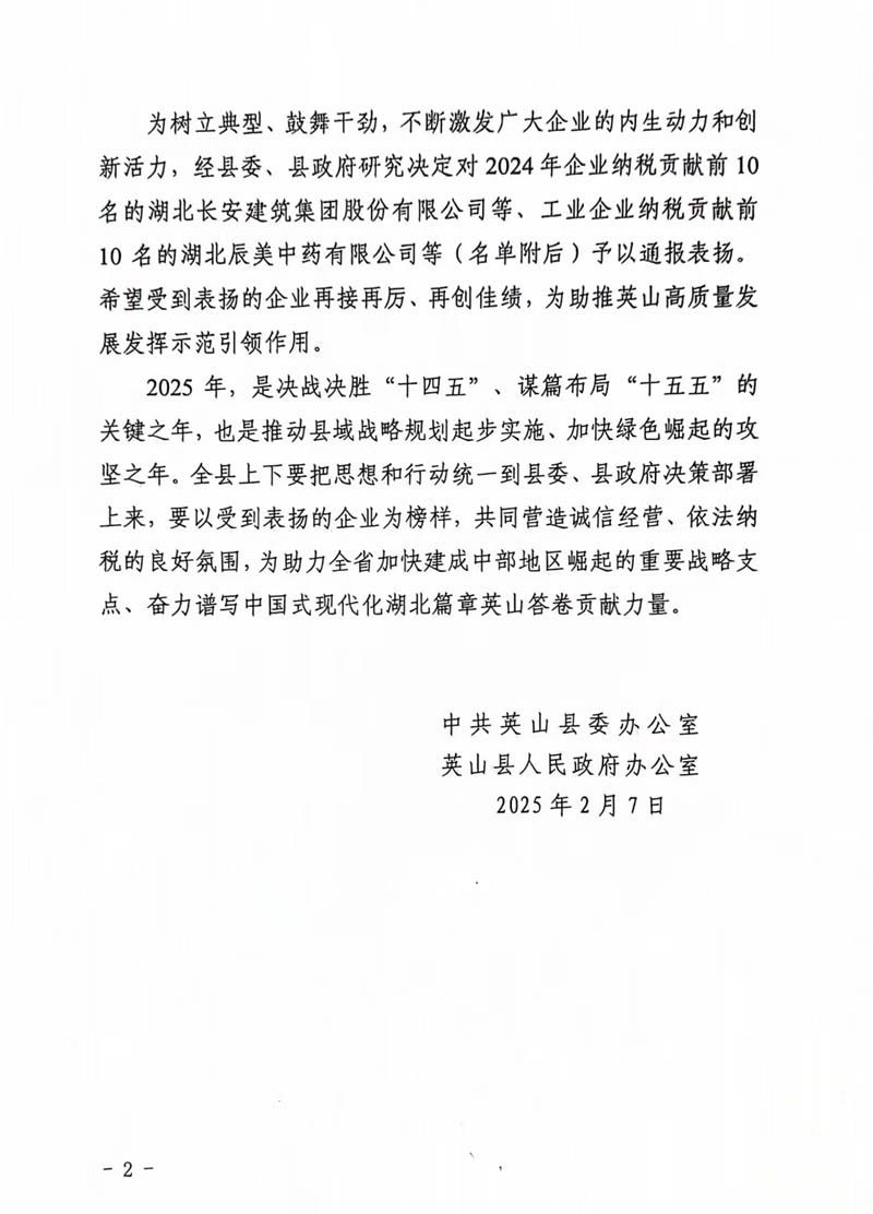 2月10日,英山縣2025年三級干部會議在英山縣禮堂召開。集團公司榮庸“2024年度經濟高質量發展貢獻單位”稱號,在“2024年企業納稅貢獻排名前10位”中榮居第1位。