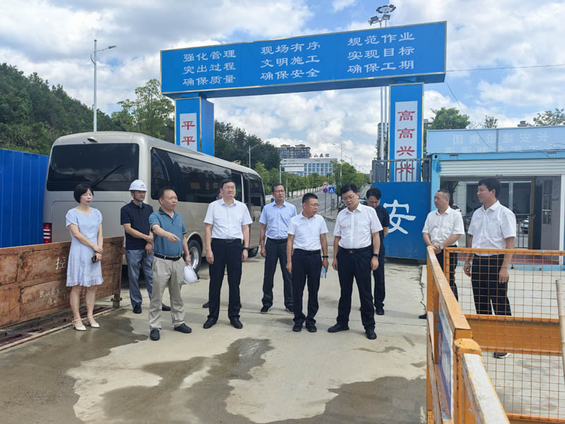 8月15日上午,湖北省公共資源交易中心(湖北省政府采購中心)黨組書記(左四)、主任胡俊明,總經濟師晏明輝,黃岡市政府黨組成員、副市長王健,市政府副秘書長饒彬,黃岡市公共資源交易中心黨組書記、主任王西華等領導到長安新城項目調研。英山縣委常委、副縣長熊谷,英山縣公共資源交易中心黨組書記、主任姜向東陪同。集團董事長葉發保(左三)就項目投資、規劃、建設情況及項目亮點進行了詳細介紹。