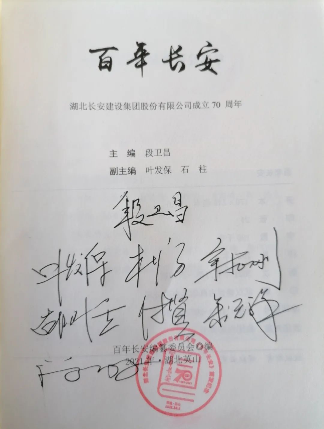 10月1日,湖北長(zhǎng)安建設(shè)集團(tuán)在英山長(zhǎng)安世紀(jì)酒店舉行了《百年長(zhǎng)安》簽發(fā)儀式。集團(tuán)董事長(zhǎng)、《百年長(zhǎng)安》主編段衛(wèi)昌,總經(jīng)理葉發(fā)保及董事會(huì)全體成員參加了簽發(fā)儀式。